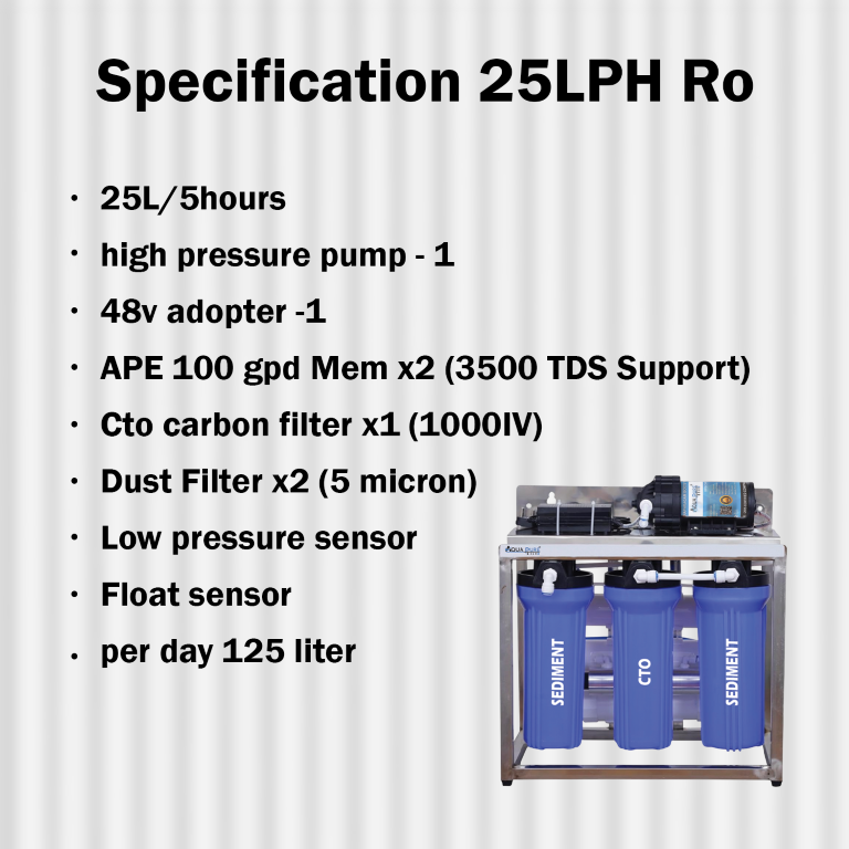 The 25 Liters Aqua Pure Commercial RO Plant is designed for reliable, high-quality water purification with a production capacity of 25 liters per hour (75 liters per day). Built with fully automatic operation, this system is ideal for small offices, food processing units, and boiler feed applications.