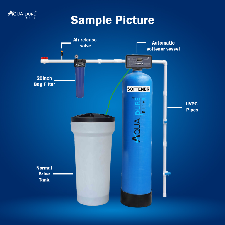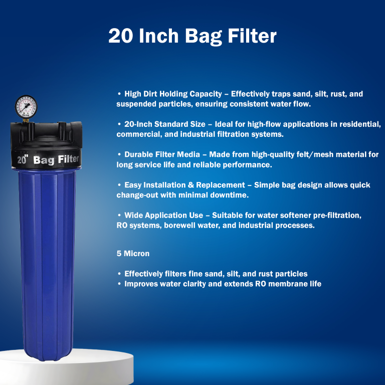 Designed for borewell water (200–1000 ppm), the system includes a 20″ Jumbo Bag Filter for effective pre-filtration. It operates reliably within a 2.5–6 bar pressure range and includes a white brine tank, requiring 20–20 kg of salt per regeneration for efficient performance.