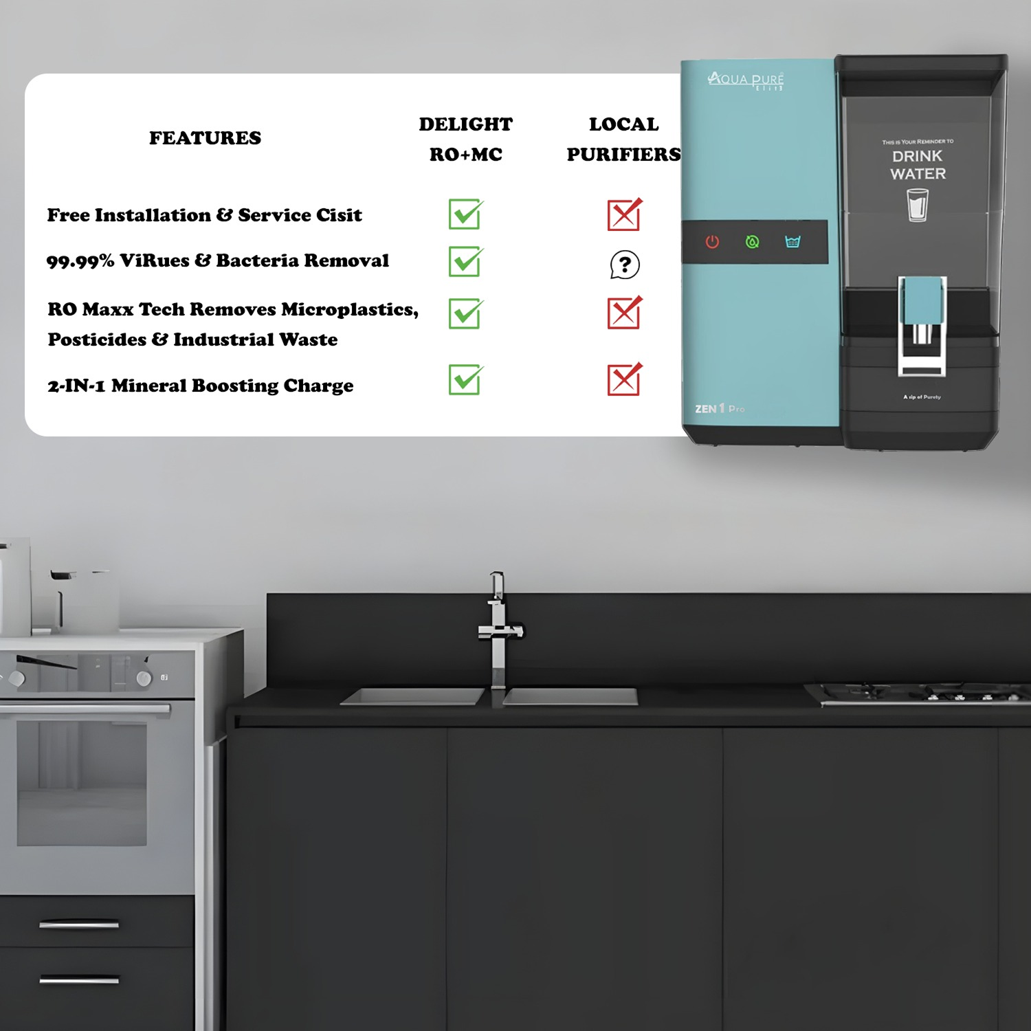- Superior 6-Stage Purification: Offers 99.9999% bacteria reduction, 99.99% virus reduction, 30x better dust and dirt removal than local purifiers, and 10x more chemical protection through Sedi Shield, Particulate Filter, and RO Maxx purification stages